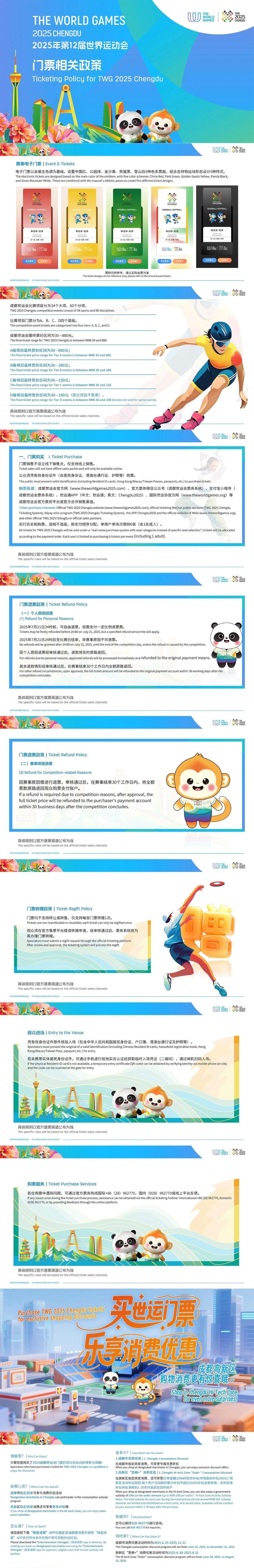 成都世运会竞赛门票均以电子门票方式出售,以会徽主色调为根底,设置我国红、公园绿、金沙黄、熊猫黑、雪山白5种色系票面,并结合吉祥物运动形状构成系列主题规划。购票概况如下: